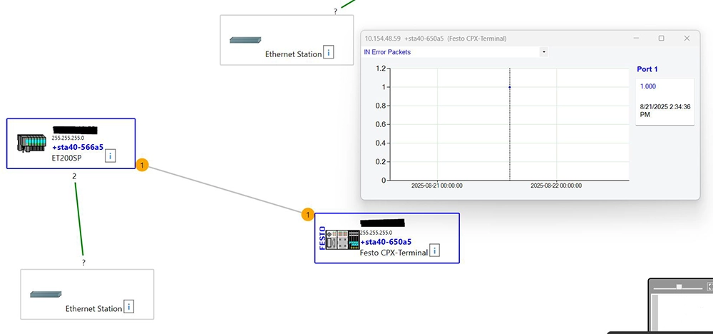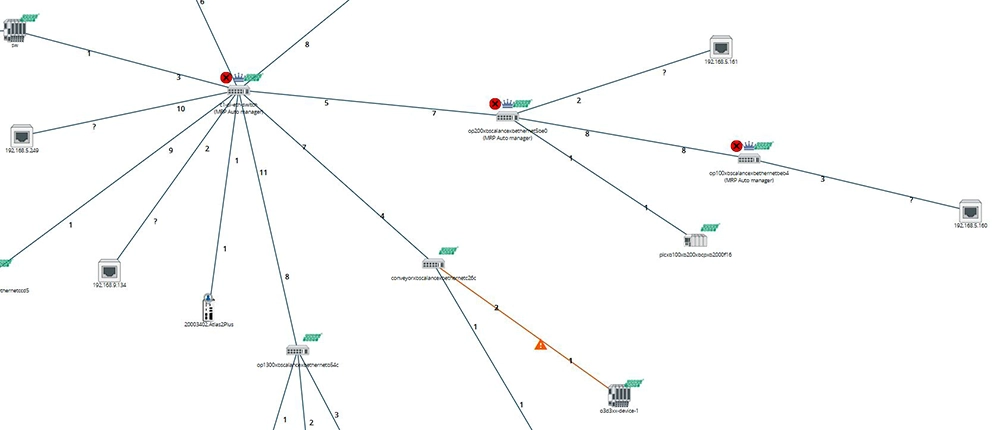 - What you see: A detailed map (topology) of the entire network with port-to-port links; IP and MAC addresses; firmware versions; data throughputs; uptime of each node; counts of damaged or dropped packets per port; and much more. These data are crucial for detecting overloaded devices or damaged cables.