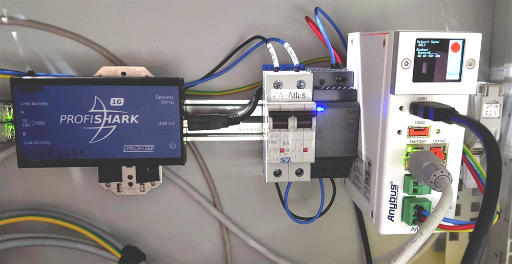 - Principle: Using an external TAP adapter inserted at the busiest part of the network (typically between a PLC and the first switch), Atlas2 non-intrusively “listens” to all communication without affecting the network. Every packet is timestamped for detailed analysis.