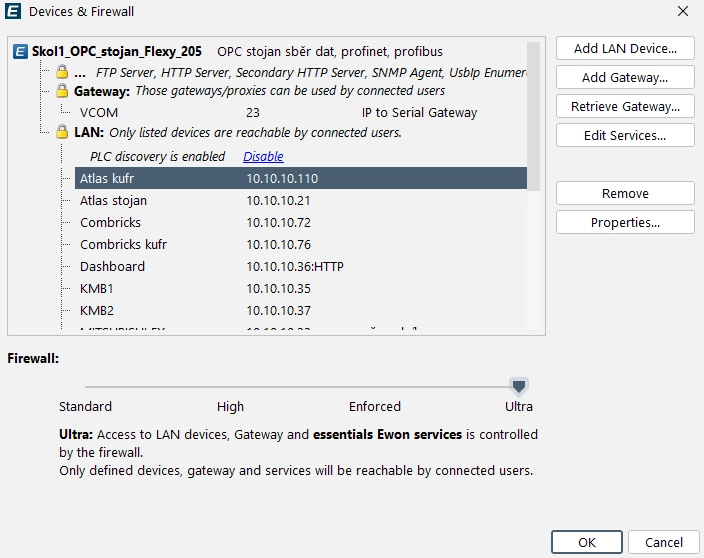 The machine’s internal network communicates only with the Ewon router—any remote access is mediated through it and governed by firewall rules. With the firewall set to Ultra, the “deny by default, allow by exception” requirement is met (all communication is blocked until explicitly permitted).