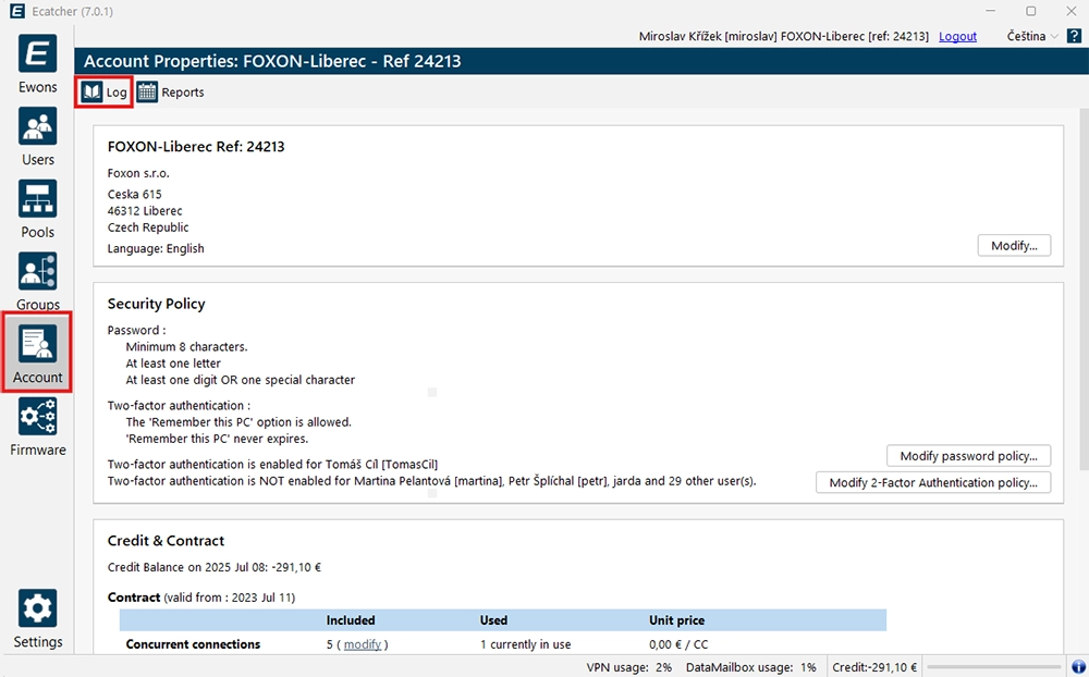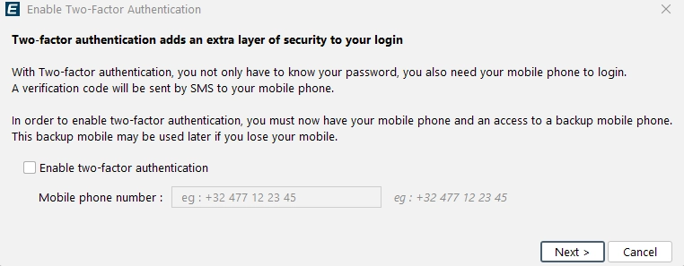 You can enable MFA in eCatcher with a single click. It ensures that, in addition to a password, the user enters a one-time code (e.g., from an SMS). This significantly reduces the risk of account compromise if the password is leaked.