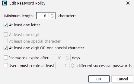 - IEC 62443-2-4 defines password requirements: 1. Minimum length of eight characters, 2. A combination of at least three of the following four character sets: lowercase letters, uppercase letters, digits, and special characters (e.g., % and #)