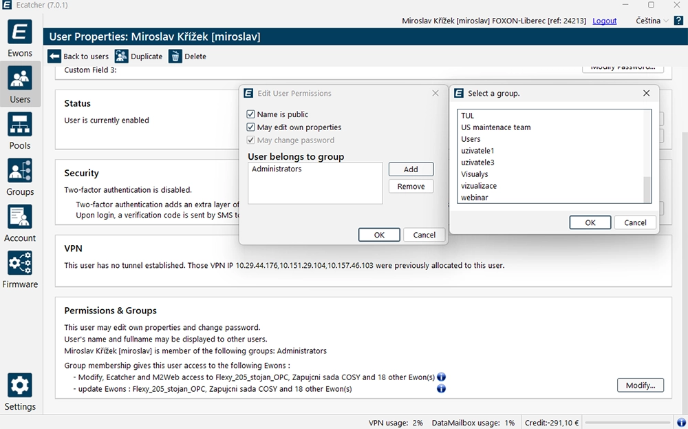 - Remote access with an Ewon router: Configurable in Talk2M using “Pools” and “Groups”