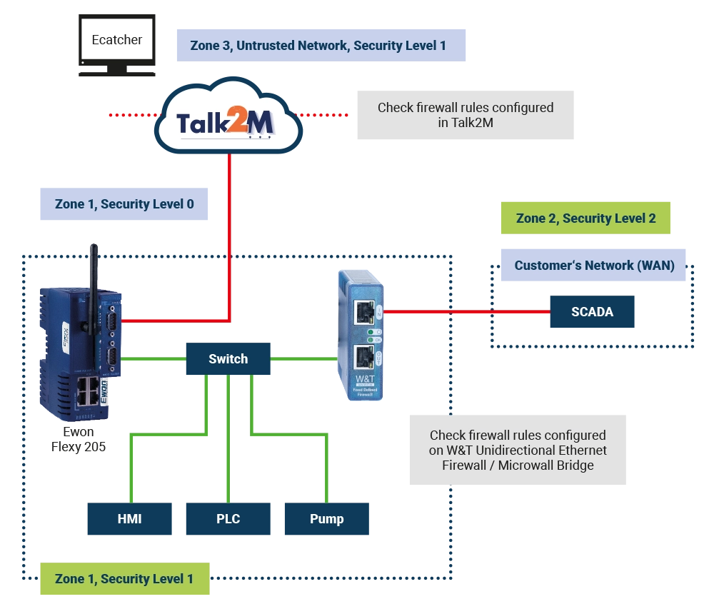 NIS2 requires networks to be divided into security zones, with only controlled communication between them. You can achieve this with a combination of an Ewon router and W&T firewalls.