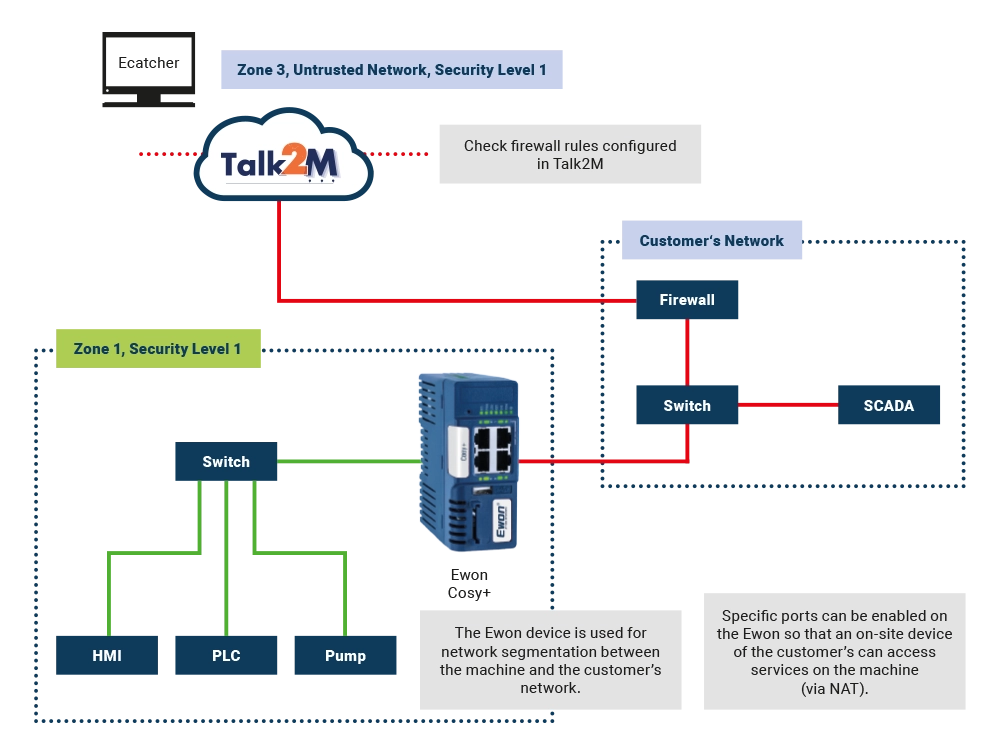 Here too, the machine remains separated. The Ewon protects the machine from a potentially compromised corporate network. Specific ports can be opened on the Ewon device so that a customer device on the local network can access services on the machine (using NAT). Remote access is mediated through the Ewon and controlled by firewall rules.